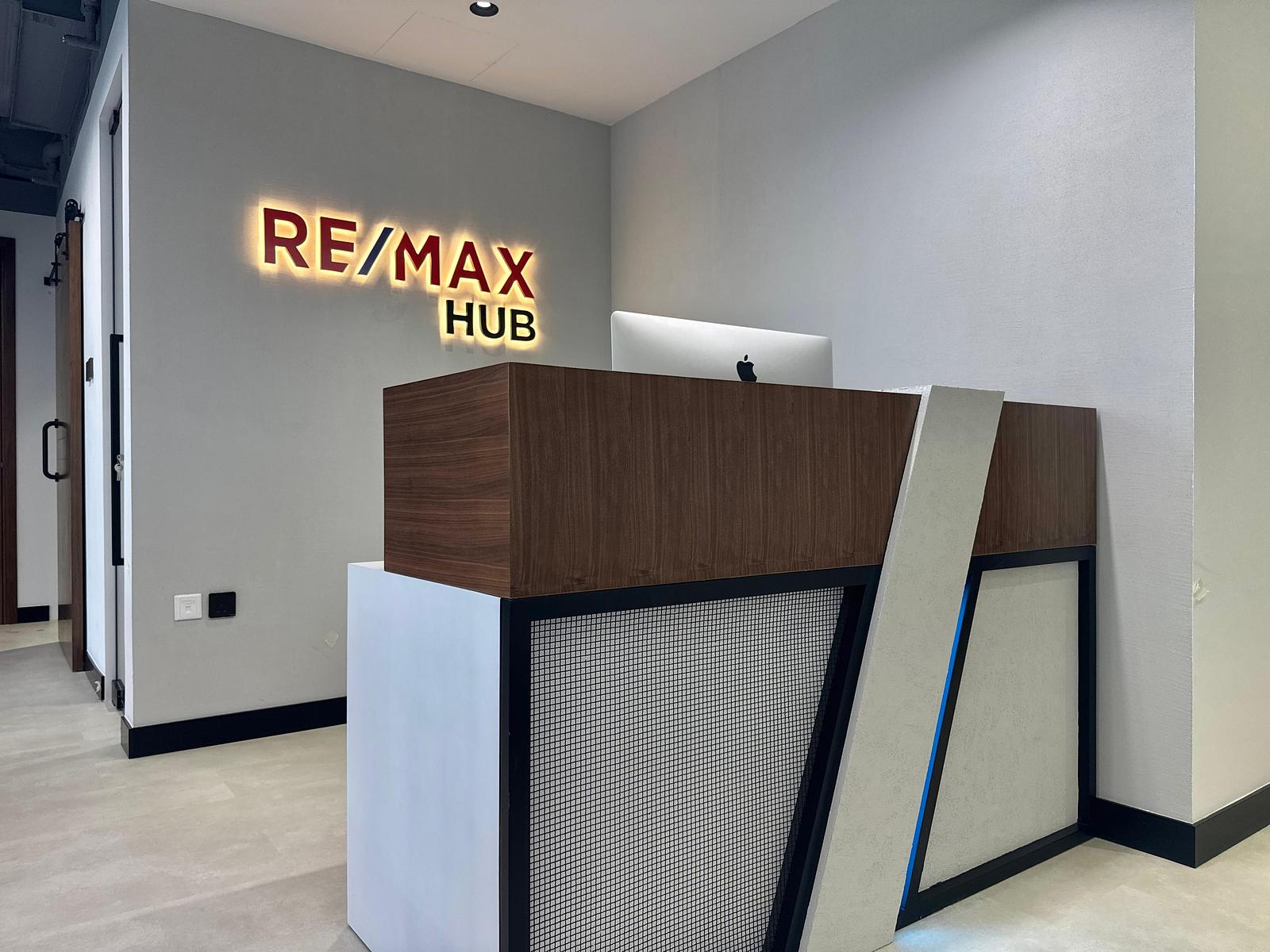 The reception area anchors the space with confidence and presence, reinforcing the RE/MAX Hub identity without overpowering the overall experience.