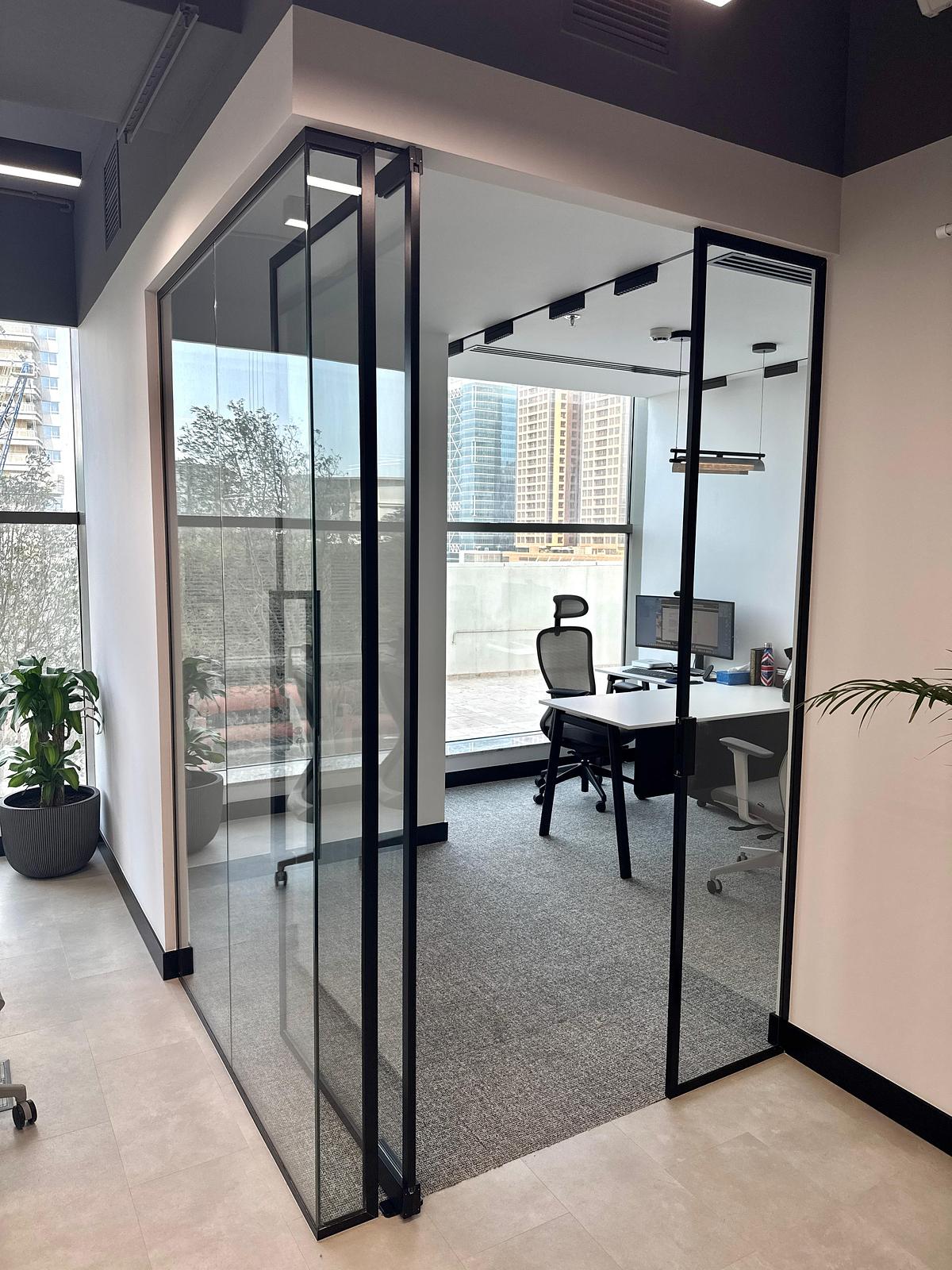 - Smart glass partitions that transition from clear to frosted, allowing instant privacy without sacrificing openness