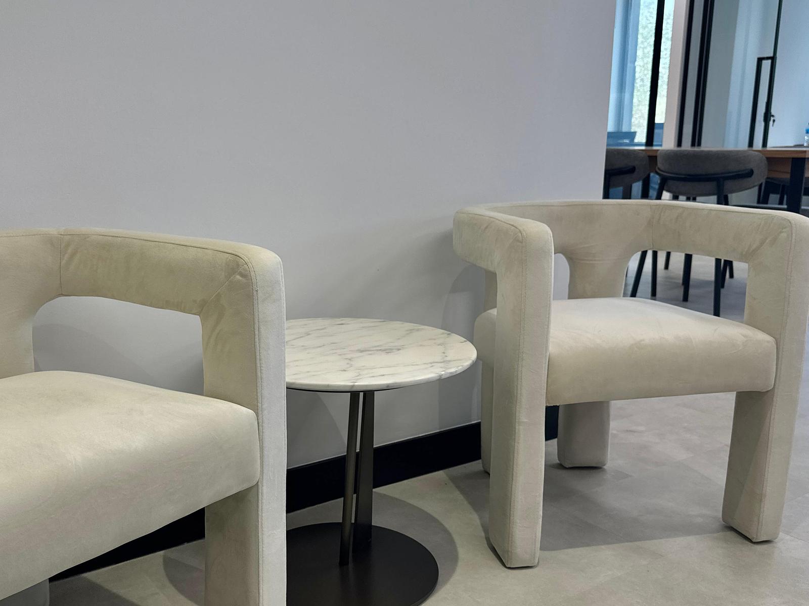 The material palette is restrained and professional, balancing warmth with clarity. Soft neutral finishes, tactile upholstery, and carefully layered lighting create an environment that feels welcoming and calm rather than corporate or rigid.